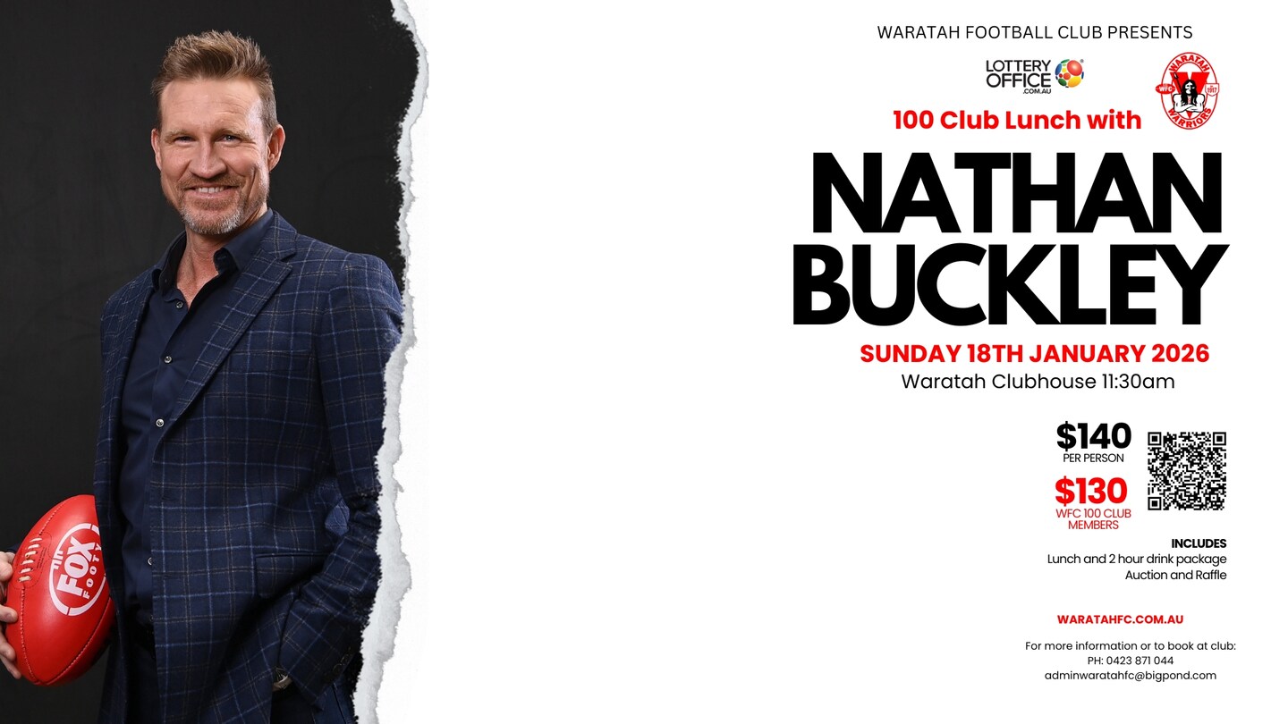 Waratah Football Club is proud to present an exclusive 100 Club Lunch with AFL great Nathan Buckley, proudly supported by The Lottery Office.